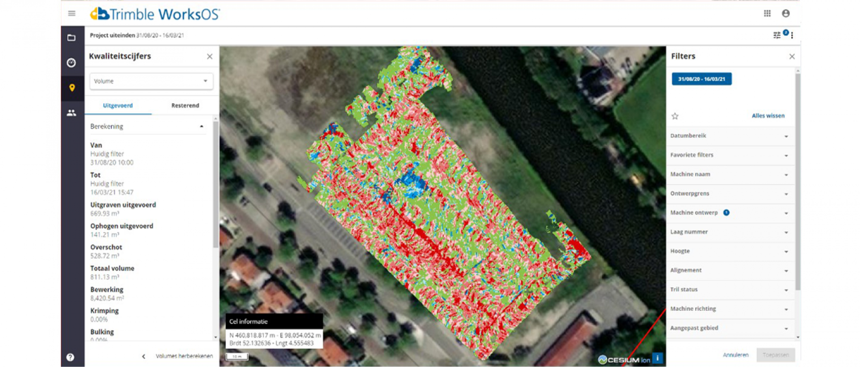 De vraag die rijst is hoe de nieuwste Trimble-software zich verhoudt tot de bestaande systemen van de fabrikanten. Die werken immers allemaal met hun eigen fleetmanagementsysteem en daar heeft Trimble ook een aandeel in. ‘Deze ontwikkeling behelst ook het assetmanagement zoals dat nu al gebeurt, maar dan van de machines in verhouding tot elkaar en het project waaraan ze werken’, legt Van Eijk uit. ‘De temperaturen, het brandstofverbruik zijn primaire machinegegevens, maar ook de vraag hoe het materieel het doet ten opzichte van de planning. Je kunt dus niet alleen zien hoeveel ton je verplaatst hebt, maar ook of dat meer of minder is dan verwacht en in de verhouding tot andere machines op die plek. Zo wordt de hele keten op elkaar afgestemd. Via het platform Works OS zijn de vorderingen te bekijken. De originele tekening is de nulmeting: inmiddels is er zoveel kuub verplaatst. Het voordeel van die uitwisseling van data is dat er op zo’n moment bekeken kan worden of er misschien een vrachtwagen bij moet, of dat ze op andere tijden moeten gaan rijden. Dat krijgt de betreffende machinist of chauffeur dan vanzelf door. Ook kan worden bepaald of de juiste machines zijn ingezet of de veranderde omstandigheden vragen om een grotere of kleinere machine. En beslissingen kun je pas nemen als je beschikt over alle data.’